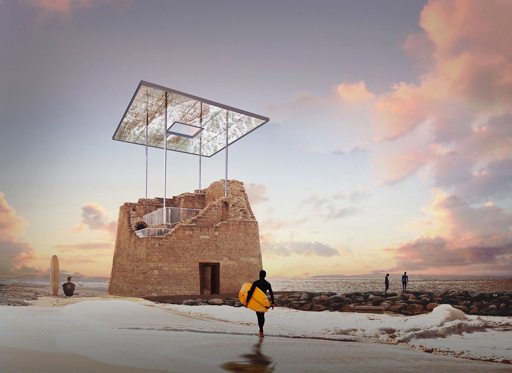 The project is based on two key points, visibility and accessibility. The first design phase, therefore, involves the insertion of a covered metal structure, which, through a well-defined path, performs both the function of framing and support the ruins of the tower. This structure, despite being totally foreign to the nature of the rock, thanks to its thin line, manages to be simultaneously distinct but also well integrated, creating a new overview of the landscape. These pillars support mirrored pieces clad in stainless steel sheets, the striking composition creates a powerful dialogue with its surroundings, reflecting the landscape, light and passers-by and drawing them into the composition. This seems predisposed to be a place of contemplation of the landscape, like other places on the Puglia coast line. The second design phase, on the other hand, involves the positioning of stairs in order to create a homogeneous path that makes the surroundings passable, from the beach to the sky. During the design process we worked with three planes: earth, sky and water, elements that we tried to unite through a minimal but effective intervention. “As above, so below” in essence, the expression looks at any place there is a duality, one where half of the duality is deemed “above” while the other half is deemed “below,” and tries to establish a relation between the two. The Camera degli Sposi, a room frescoed with illusionistic paintings by Andrea Mantegna in the Ducal Palace in Mantua played played an important role as a reference in our proposal. Even tho Mantegna tried to externalize an interior, our proposal tries to bring the two planes into the same unity.
