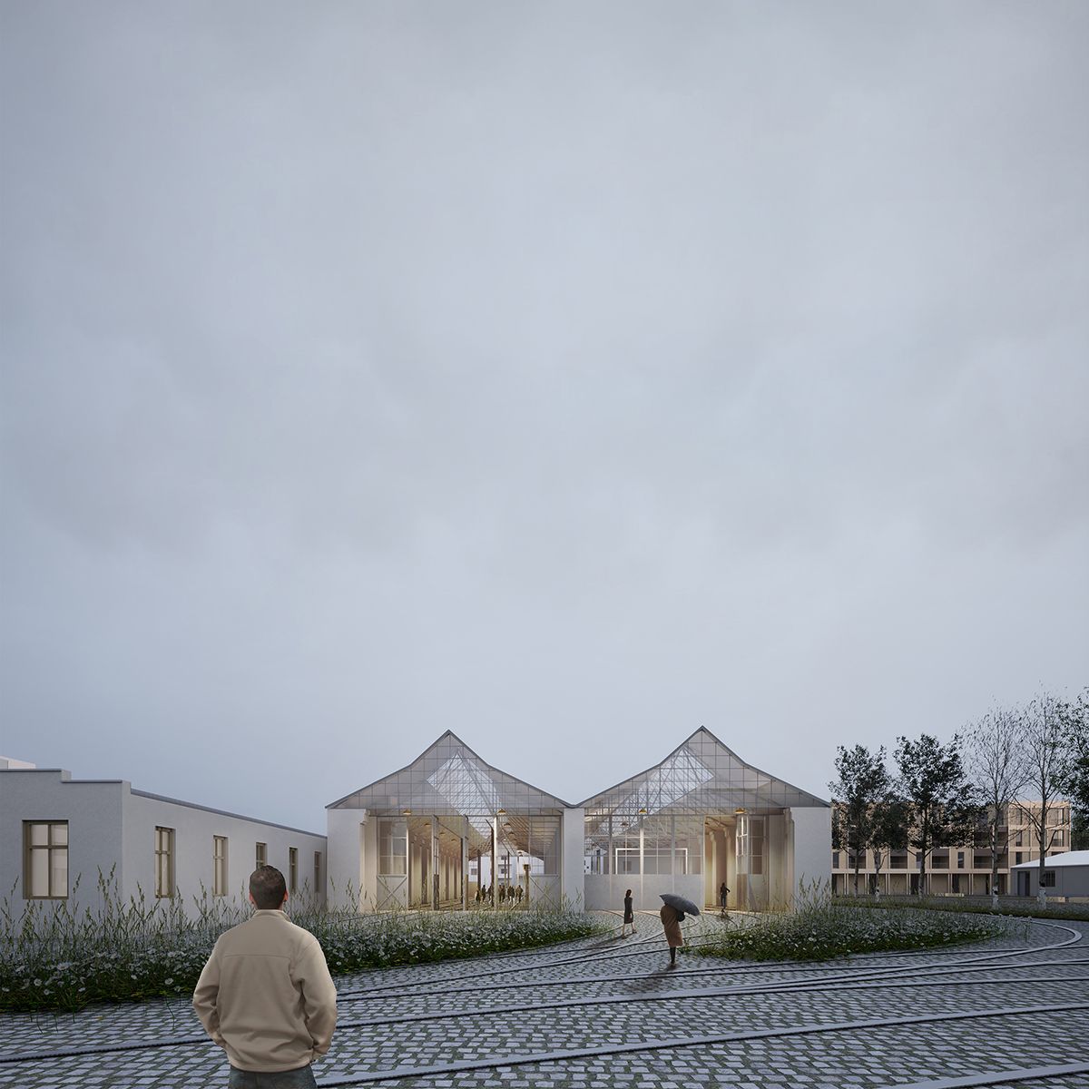 First and foremost, there is a desire to conserve existing architectural objects, some of which are already classified as Category A monuments, and subject them to restoration and repurposing. The newly proposed building is integrated into the structure of existing metal halls on the site and functions closely with them. A public garden is organized, serving as a mediating element between the urban and the natural, a flexible space capable of adapting to issues caused by floods and water fluctuations. The study and proposal follow the idea of an unpredictable, ever-changing landscape in which rain, seasons, and environmental changes shape the landscape differently. Walking paths appear and disappear beneath the water's surface, constantly projecting a new image.