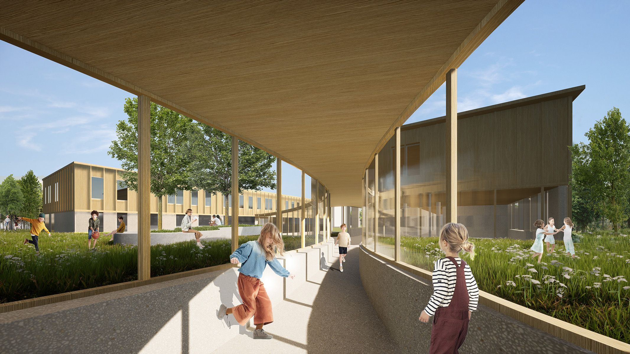 Școala este compusă din patru volume interconectate prin coridoare de sticlă care dizolva granițele exterioare si conectează elevii cu natura. Situată pe un teren în pantă, răspunde mediului său natural. Volumele sunt aranjate la cote diferite, primul volum de la stradă situat la cota cea mai joasă, iar ultimul volum la cota cea mai înaltă. Această creștere este observabilă de la nivelul străzii principale. De asemenea există si o creștere la nivelul funcțiunilor. Ansamblul este organizat într-o cărare șerpuită asemănătoare jocurilor de societate cu start/finish, fiecare volum servește o funcție separată. Primul volum este destinat întregii comunități si găzduiește o mediatecă, oferind prima interacțiune a viitorilor elevi cu acest ansamblu, (start). Următoarele două volume sunt destinate elevilor din clasele I-IV respectiv V-VIII, (finish). Ultimul volum este o sală de sport care poate fi folosită de localnici.