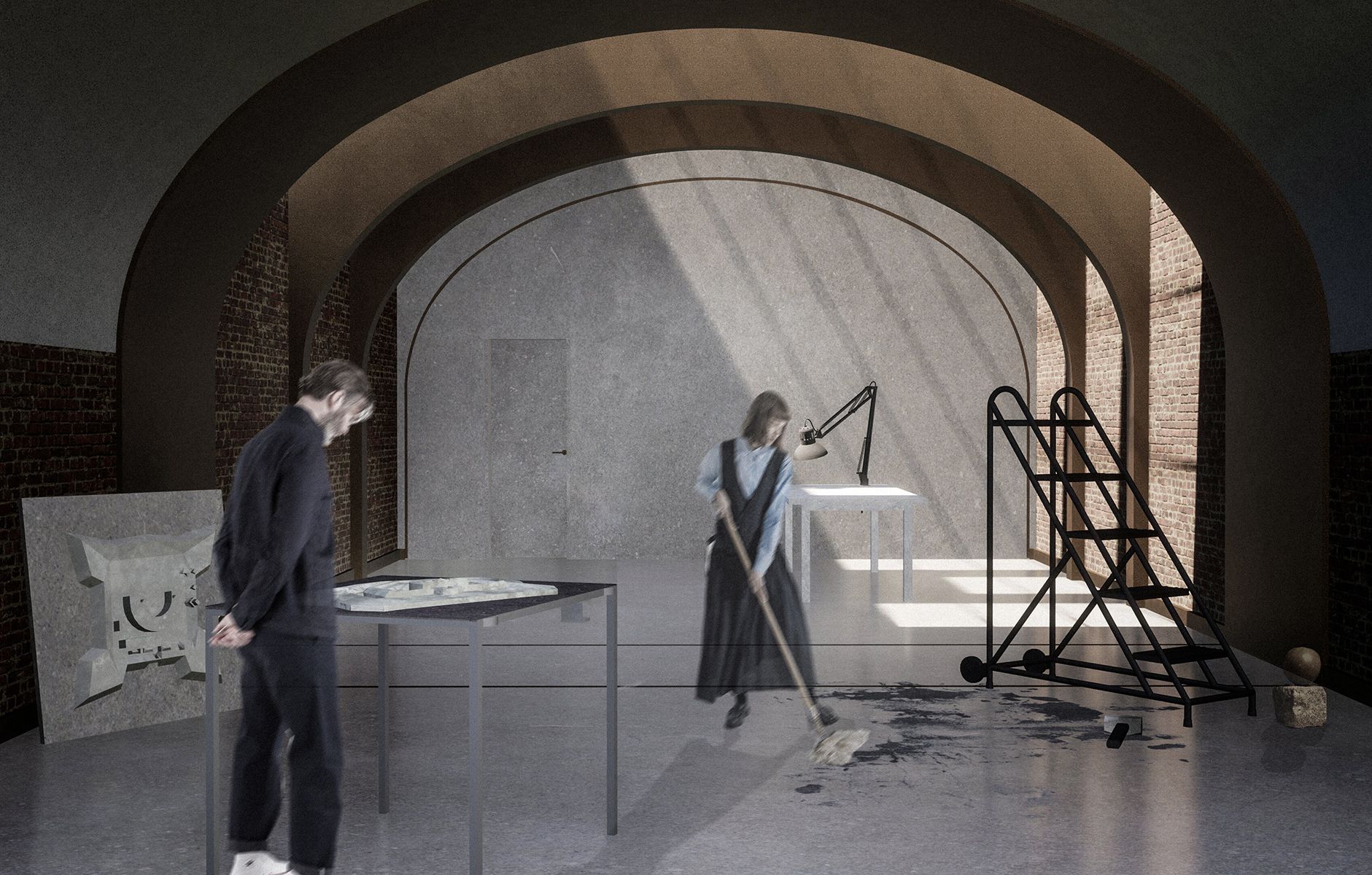 The architectural project aims to transform and extend the Leonida garages into a contemporary art museum, breathing new life into this historic space. It also serves as a tribute to the cultural heritage of Bucharest. The presented image illustrates a view from a converted exhibition hall dedicated to a permanent exhibition of Constantin Brâncuși's works.