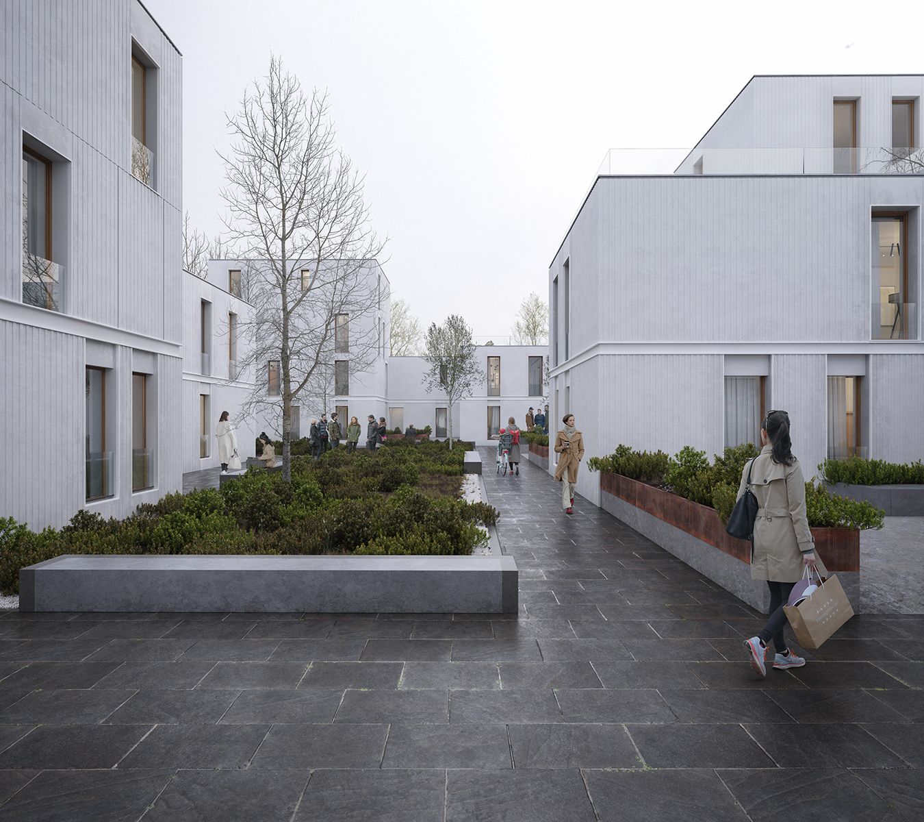 Ansamblul propune un alt tip de locuire, ce pornește de la întrebarea ”How will we live together?”, amestecând în volume diferite două tipologii de locuire: cea colectivă - mai aproape de locuința unifamilială - și co-housing. Proiectul îmbină cele două tipuri de țesut prezente în imediata vecinătate a parcelei - țesutul tradițional de case, fragmentat și scund, și țesutul de blocuri apărute în timpul socialismului, preluând avantajele fiecăruia. Am pornit de la dorința de a aduce avantajele locuirii la casă în cadrul locuințelor colective, astfel încât, prin detașarea de limitele laterale ale parcelei și alipirea punctuală la calcane, am creat curți private pentru apartamentele de la parter, creând astfel o zonă plantată, liniștită, spre care, în fapt, toate apartamentele se orientează cu spațiile interioare private. În proiect am integrat două tipuri de curți, care răspund unor cerințe și activități diferite. Pe lângă tipologia curților private, deja menționate, există curtea minerală, care face trecerea de la public la spațiul comunității, intermediind relația dintre stradă și interiorul ansamblului, vegetația fiind punctuală, organizată pe un grid. Curtea reprezentată în imagine se situează la intersecția dintre „public” - al comunității - și privat: este un loc ascuns, accesat prin gang, dar deschis întregii comunități, relaționând cu un spațiu interior multifuncțional, adresat rezidenților. Are astfel liniștea unei curți private, în timp ce reprezintă un loc de întâlnire, de socializare.