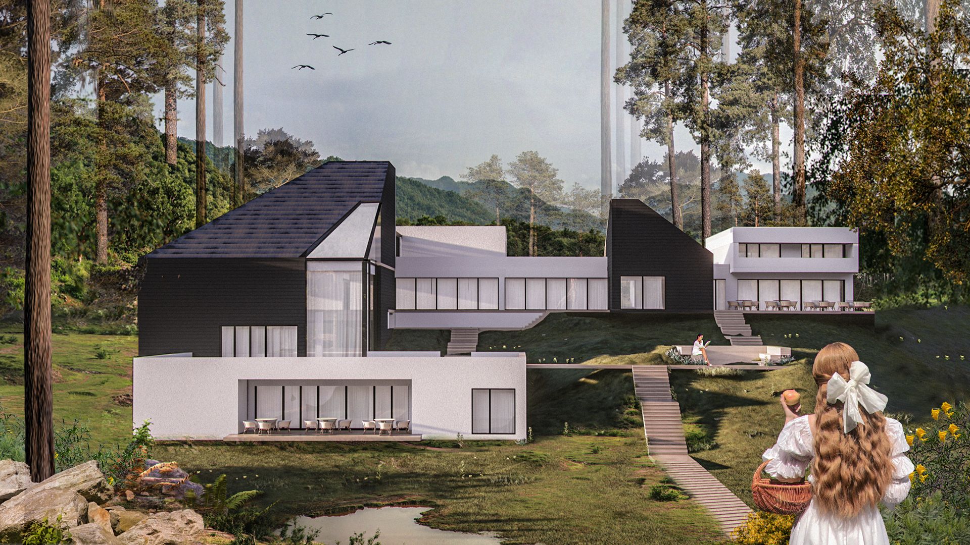 Acest exercițiu are drept scop aducerea în centrul atenției a conexiunii profunde dintre om și natură, prin crearea unor spații interstițiale ingenioase, astfel încât turiștii să poată experimenta o prelungire a frumuseții mediului natural în spațiul interior. Arhitectura a fost integrată în teren într-un mod discret, folosind materiale precum lemn și beton. Acestea se imbină cu grație în peisajul natural, neînfruntându-l, ci, dimpotrivă îmbinându-se armonios cu acesta, alcătuind o serie de volume identice care completează frumos peisajul. Cantități generoase de sticlă au fost folosite pentru a crea conexiuni fluide între interior și mediul înconjurător, fiecare cameră fiind proiectată astfel încât să ofere o panoramă către vale sau către pădure. Forma acoperișurilor este inspirată de verticalitatea dealurilor vecine, în posibilitatea de a aborda crestele copacilor într-un mod blând și subtil. Oculusul reprezintă o reverență adusă acestei conexiuni fundamentale dintre om-natură. Pensiunea dispune de o varietate de facilități pentru a satisface nevoile turiștilor, de la terasele spațioase, cramă, până la spații de relaxare interioare pentru seri liniștite în fața șemineului, precum și platformă pentru observarea cerlului înstelat prin "oculus". Astfel, pensiunea este concepută astfel încât să se simtă ca una, luxul proiectului fiind zona exterioară și frumusețea sitului.